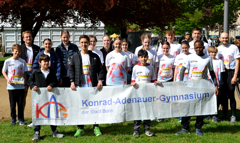 Mit sechs Schülerstaffeln und einer Lehrerstaffel ist das Konrad-Adenauer-Gymnasium am Deutsche Post Marathon Bonn 2026 angetreten: Am 19. April nahmen 36 Schülerinnen und Schüler sowie 6 Lehrkräfte an der Veranstaltung teil, bei der insgesamt sage und schreibe 258 Schulstaffeln unter dem diesjährigen Moto „Laufend jeck“ anlässlich der Zweihundert-Jahr-Feier des Bonner Karnevals liefen. Mit 22.222 Läuferinnen und Läufern gab es in diesem Jahr einen Teilnehmerrekord – 4.000 mehr als im Vorjahr.